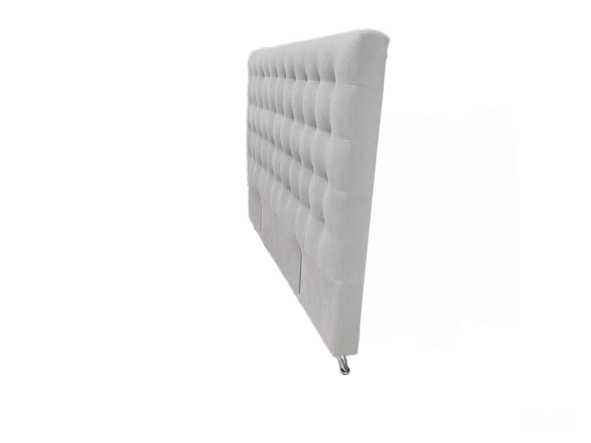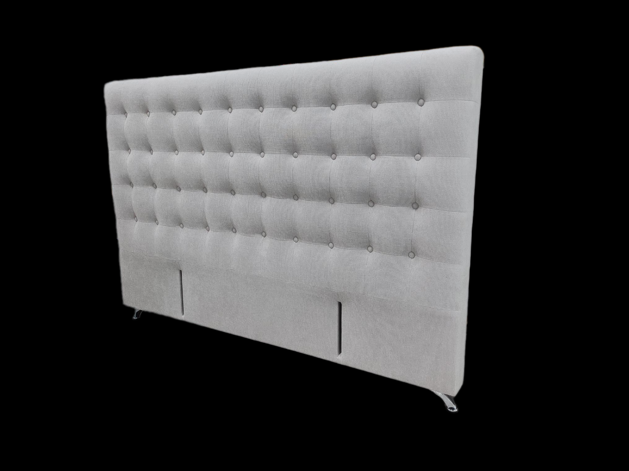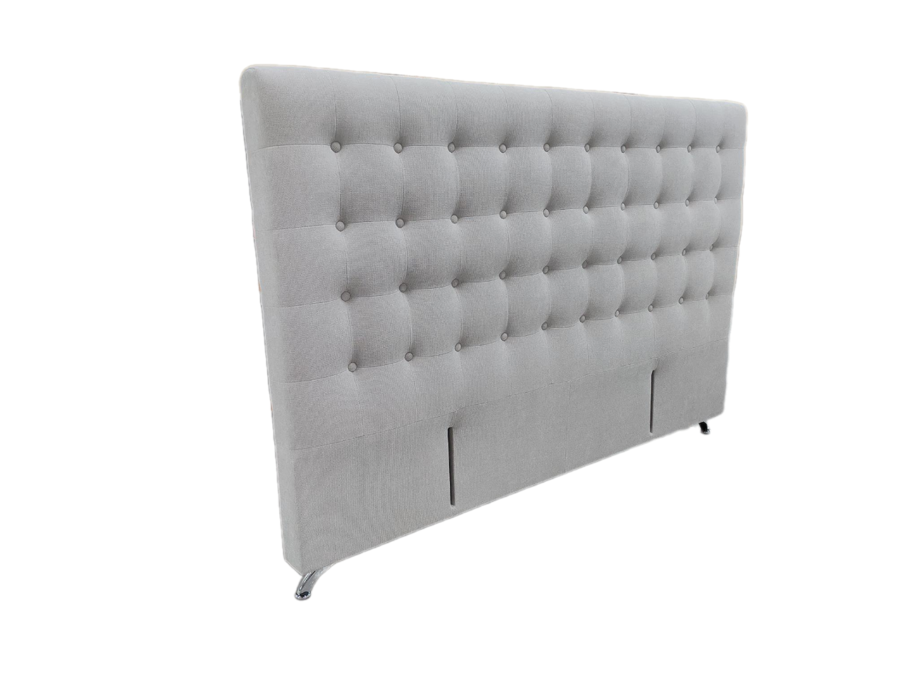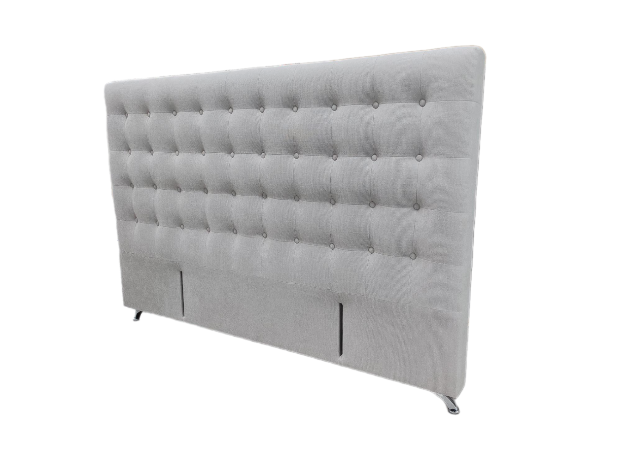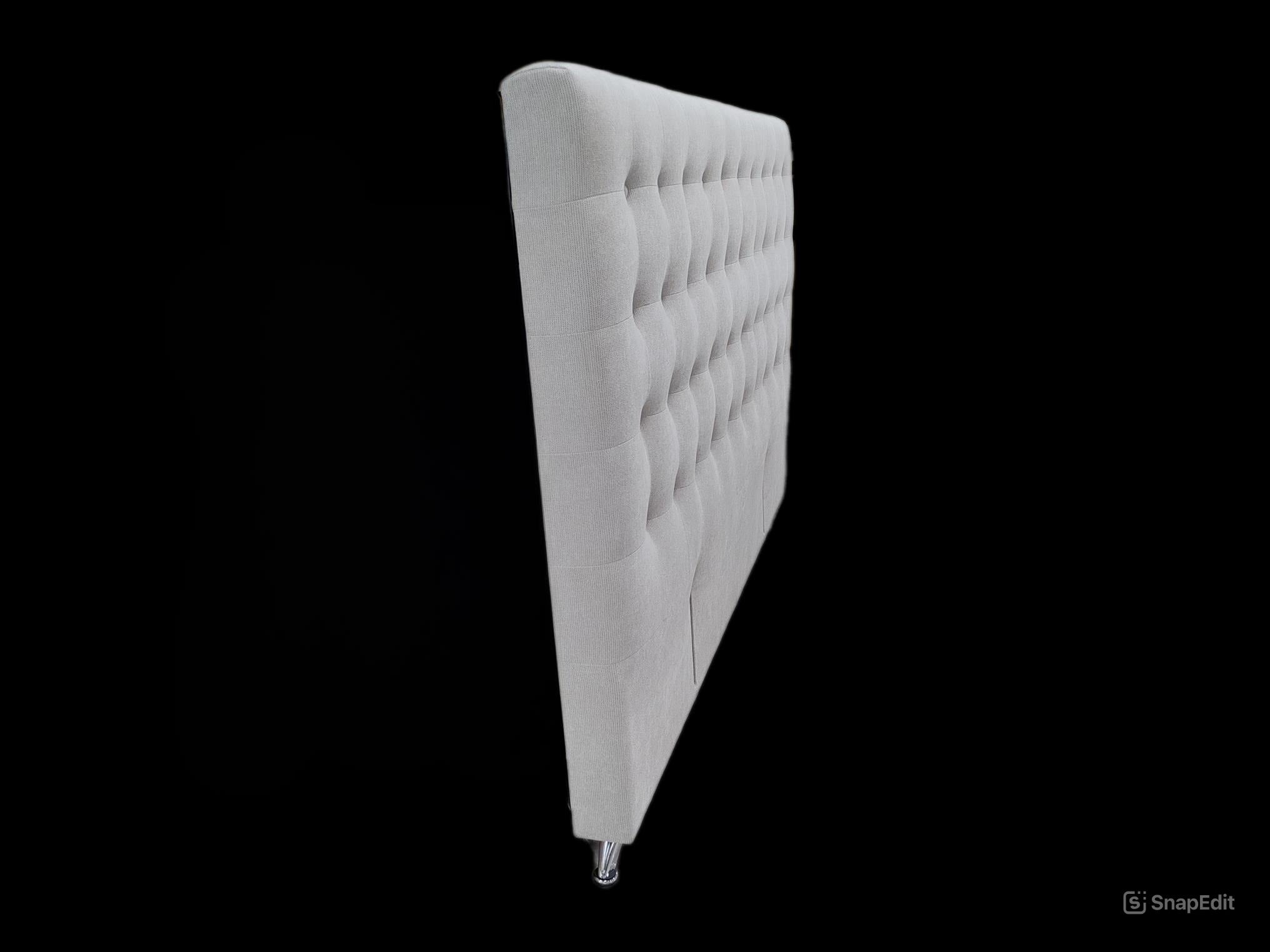 Our elegant headboards will help transform your bedroom into a haven that you want to come home to every night. This neutral pattern with a modern design gives a touch of style to your bedroom. This button-tufted french-pleated headboard fits into an array of decorative schemes. Full floor standing headboard.