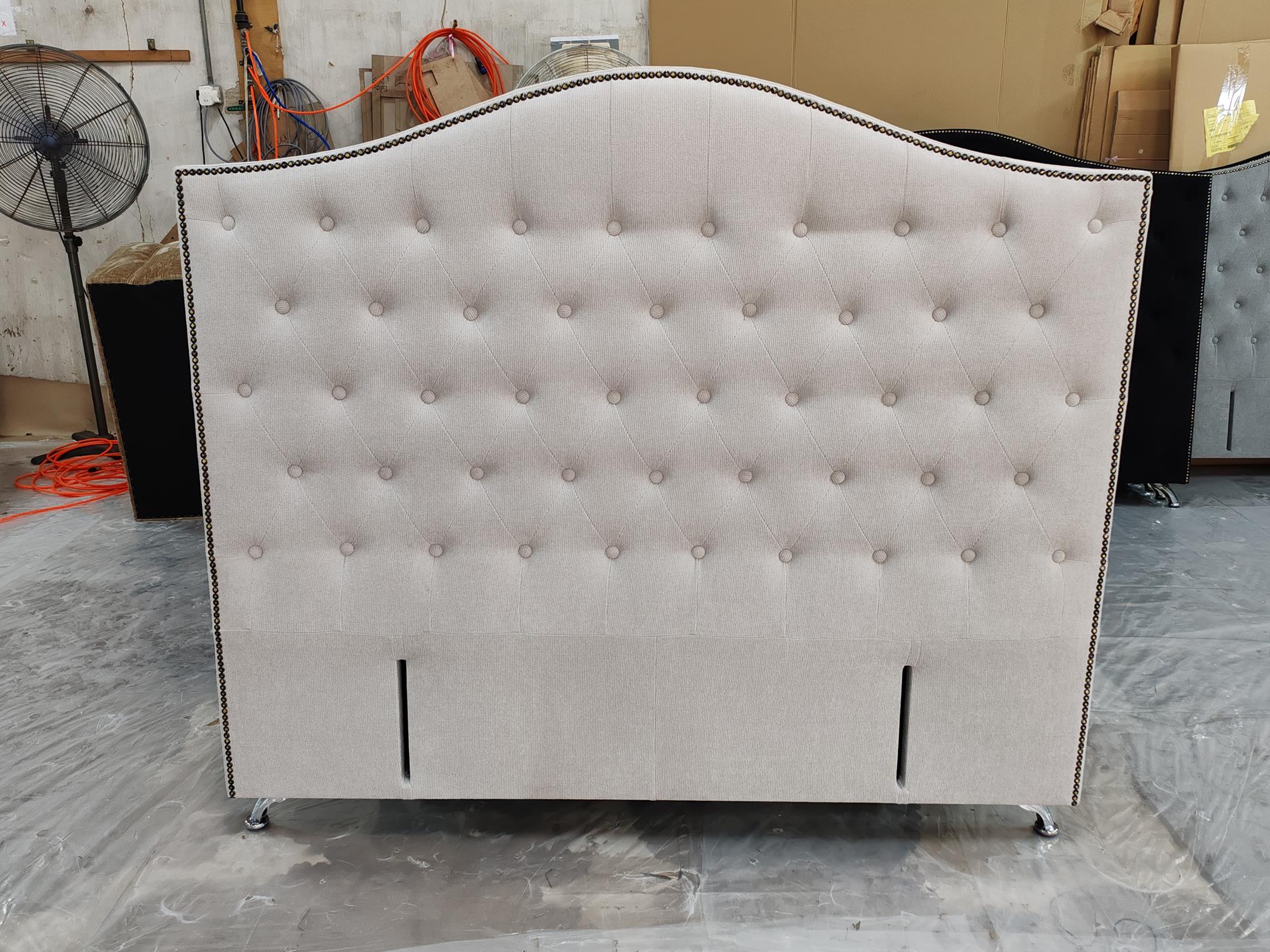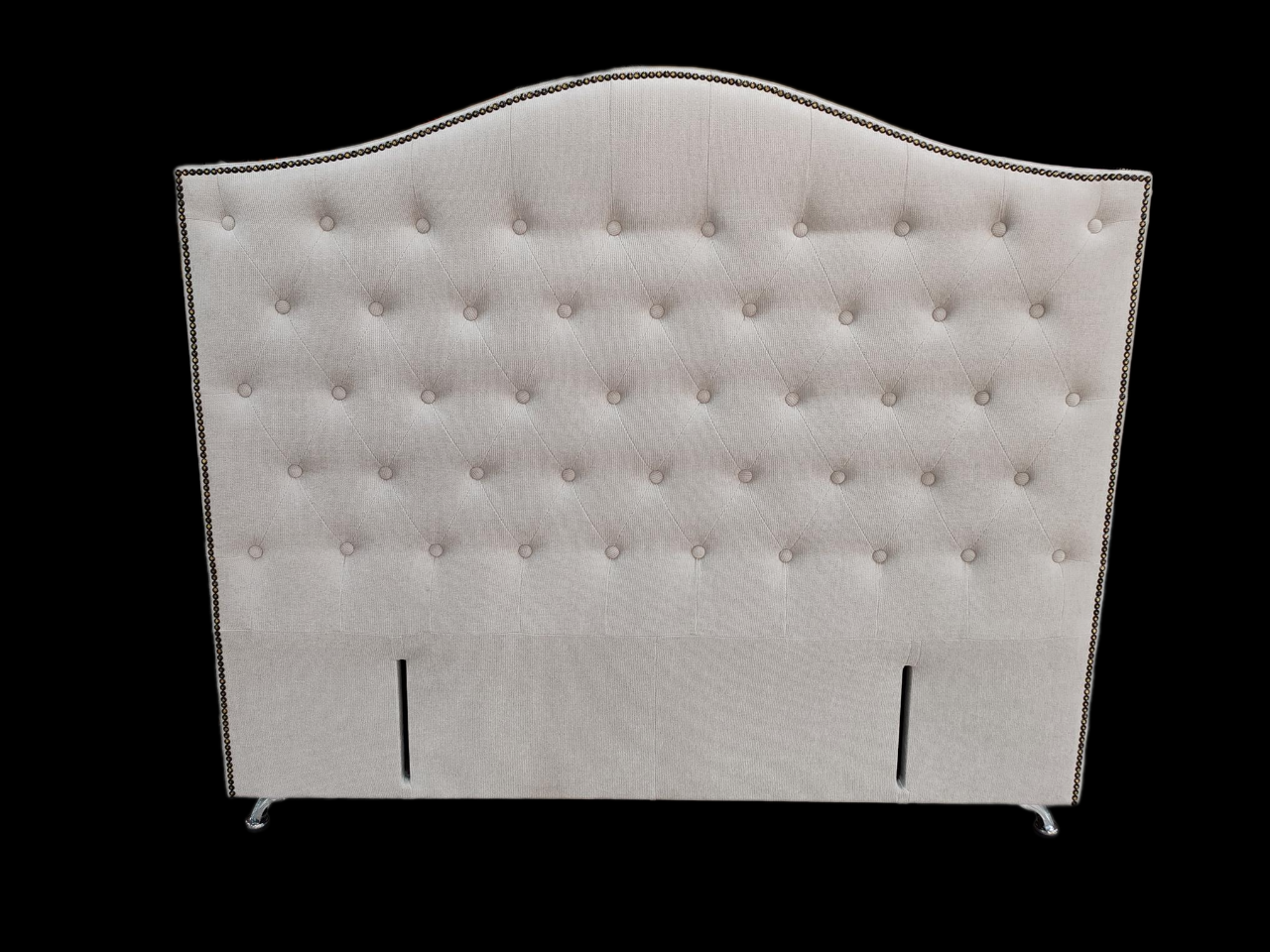 Our elegant headboards will help transform your bedroom into a haven that you want to come home to every night. This neutral pattern with a modern design gives a touch of style to your bedroom. This button-tufted french-pleated headboard fits into an array of decorative schemes. Full floor standing headboard.