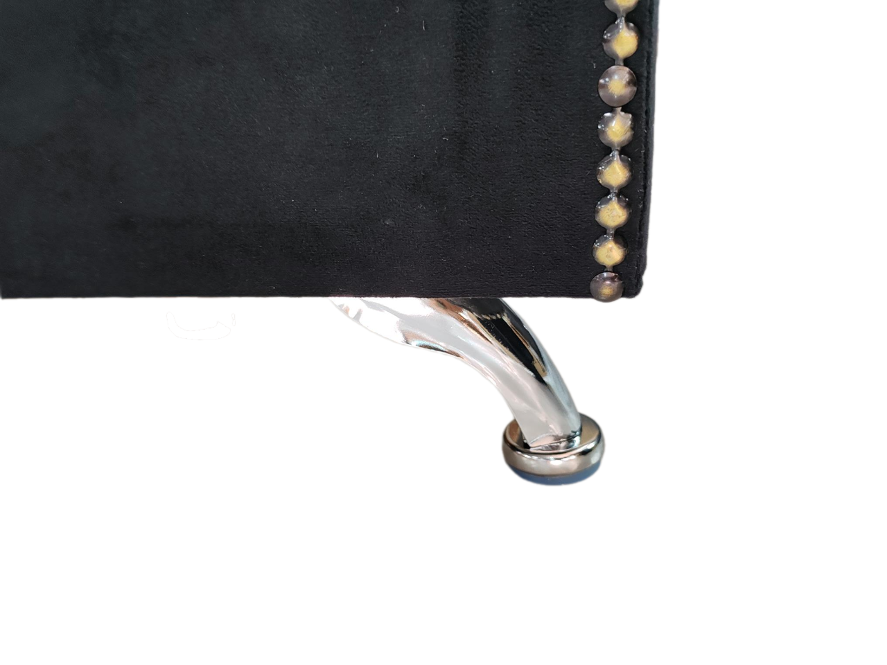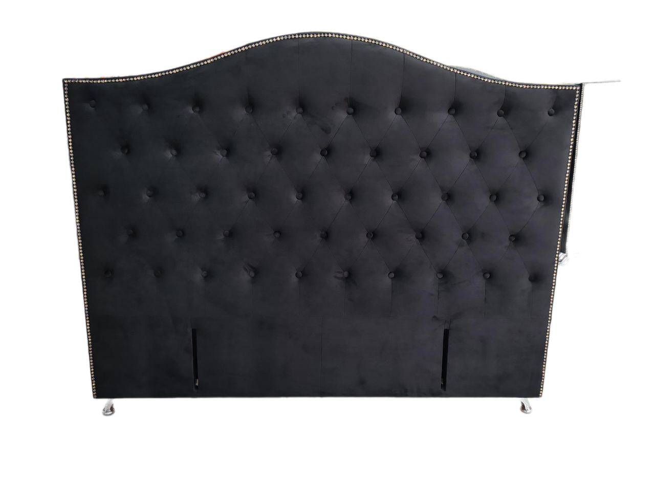Add timeless sophistication to your bedroom with this grand black velvet headboard, featuring an elegantly curved silhouette and deep-button tufted detailing for a luxurious finish. The plush velvet upholstery is complemented by striking nailhead trim and sleek chrome legs, offering a bold yet refined statement.