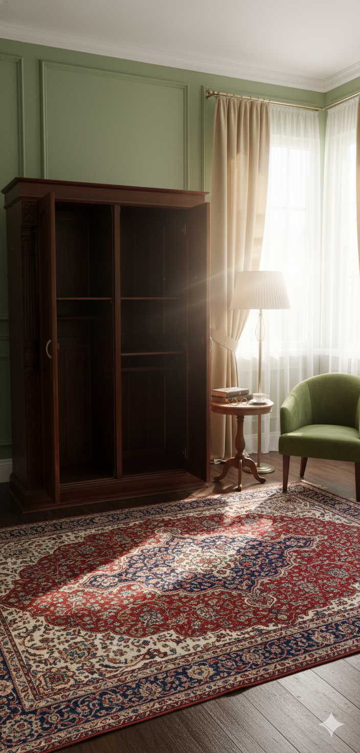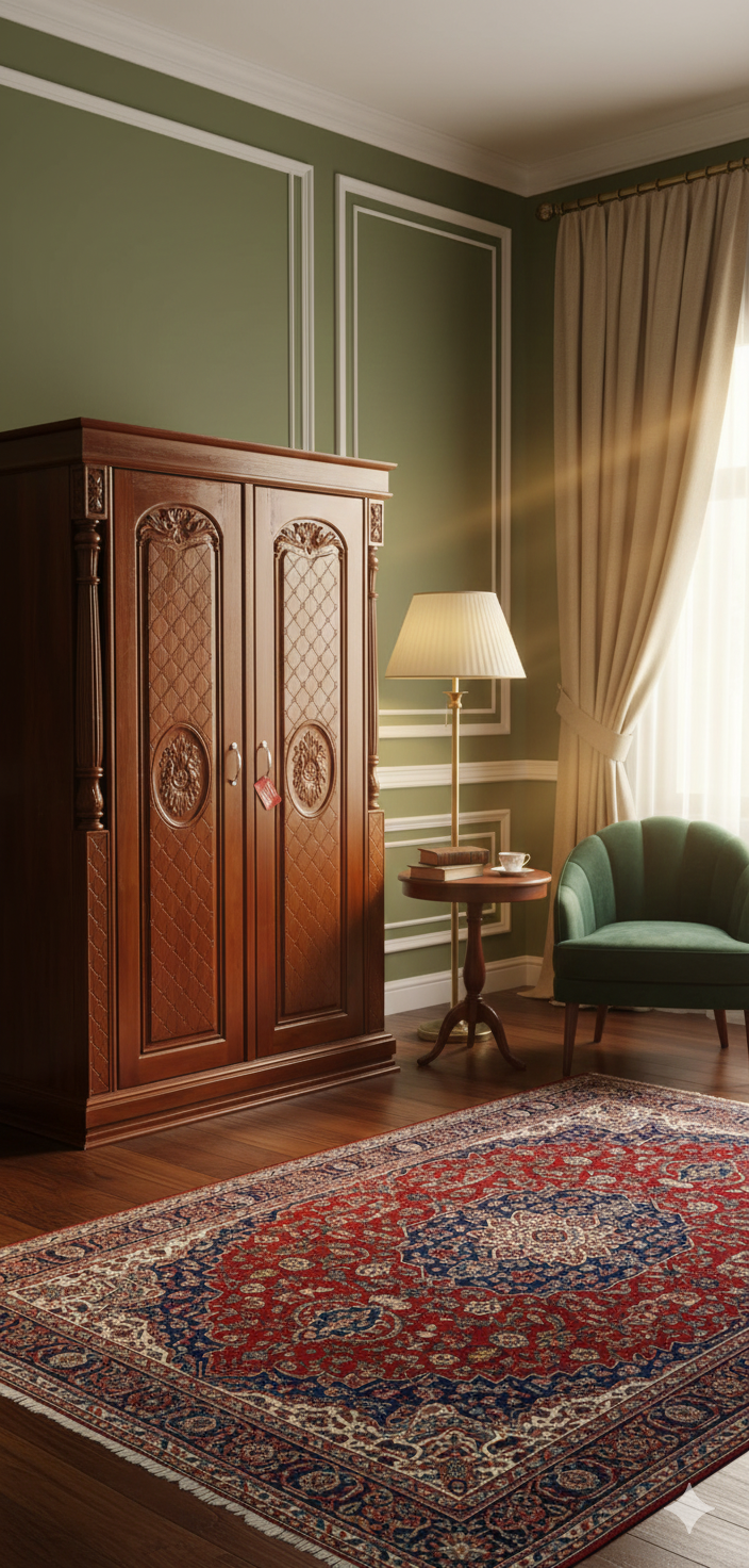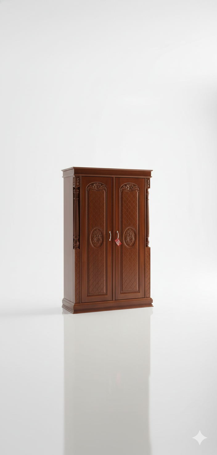 A classic wooden storage cabinet featuring elegant carved detailing and a rich brown finish. Designed with double doors and spacious internal storage, it’s perfect for organising essentials while adding a timeless, traditional touch to living rooms, bedrooms, or hallways.